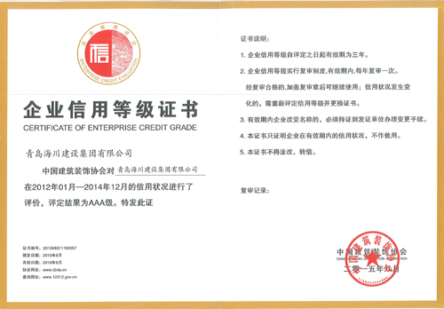 近日,海川集團從中國建筑裝飾協(xié)會捧回“企業(yè)信用評價AAA級信用企業(yè)”獎牌和證書。該證書是中國建筑裝飾協(xié)會對海川集團在2012年1月—2014年12月的信用狀況進行評價,并評定為AAA級后于2015年8月予以頒發(fā)的,有效期三年,至2018年8月。