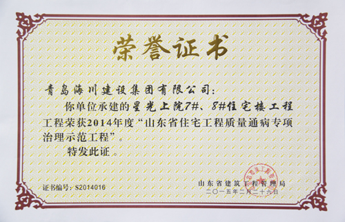 公司最近從省建筑工程管理局接連捧回四項(xiàng)省級(jí)榮譽(yù)證書,分別是:一分公司中創(chuàng)大廈工程榮獲“2014年度山東省建筑工程優(yōu)質(zhì)結(jié)構(gòu)杯獎(jiǎng)”,四分公司星光上院7#、8#住宅樓工程榮獲“2014年度山東省住宅工程質(zhì)量通病專項(xiàng)治理示范工程”。七分公司青島農(nóng)業(yè)大學(xué)新建科技實(shí)驗(yàn)樓工程接連榮獲“2014年度山東省建筑施工安全文明標(biāo)準(zhǔn)化優(yōu)良工地”和 “2014年度山東省建筑工程優(yōu)質(zhì)結(jié)構(gòu)杯獎(jiǎng)”兩項(xiàng)榮譽(yù)。
